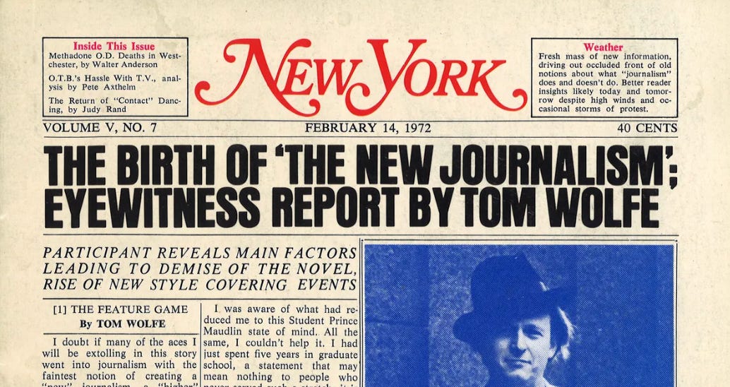 At some point during my early years in New York, which I spent diligently trying to recreate Sex and the City but mostly reaffirming the revolutionary profundity of Lena Dunham, I became obsessed with Tom Wolfe and the writing style he popularized called New Journalism.